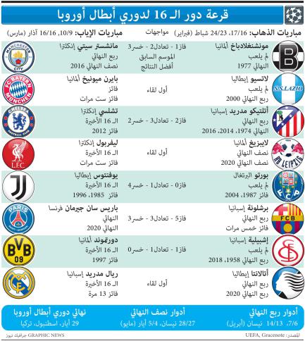 أما ريال مدريد زعيم المسابقة القارية مع 13 لقبًا، فيواجه أتالانتا الايطالي الذي بلغ الادوار الاقصائية للعام الثاني تواليًا في مشاركته الثانية في دوري الابطال، علمًا أنه وصل الى ربع النهائي في النسخة السابقة في إنجاز تاريخي.