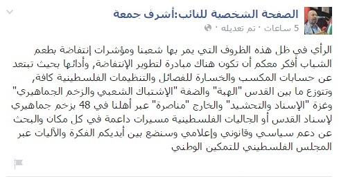 وعبر جمعة عبر صفحته الشخصية علي موقع التواصل الاجتماعي فيسبوك عن رأيه الشخصي بتقديم مبادرة من المجلس الفلسطيني للتمكين الوطني الذي يضم جميع فئات وفصائل الشعب الفلسطيني ، لتطوير الهبة الجماهيرية لتصل الي الانتفاضة الشعبية الشاملة بحيث يتم توزيع الأدوار بين المدن والقري الفلسطينية بزخم جماهيري واسع يخرج للشوارع نحو هدف واحد وهو إسناد القدس الشريف ودعم صمود اهلها المرابطين .
